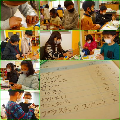 こちらのクラスでは、電気を通すものにどんなものがあるか予想した後、実際に確かめていました。缶は、塗られている部分とそうでない部分で違いがあるかもしれないと一生懸命塗料をこすって地金を出して確かめていました。