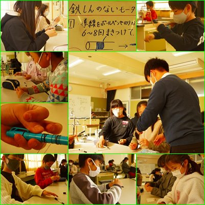 鉄心のないモーターと、あるモーターを比較するために、手製のコイルづくりをしていました。コイルを作るには、いろいろな条件があるようで、両側のコードの長さを使い勝手が良いように同じくらいの長さにしたり、コイルの端を紙やすりで削るのにも、片方は上半分、片方は全部といった様子でなかなか複雑です。