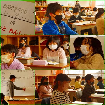 0から1000までの数直線に目盛りがふってあります。一目盛りがいくつになるのかを考えていました。すでに10000よりも小さい数についても考えたことがある様子で、ちょっとした話し合いの末、一目盛りが100ずつになっていることに気づくことができていました