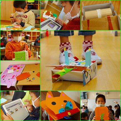 「ゴムゴムパワー」という教材です。ゴムの力でひもが巻き取られると、自分が作った作品がスルスルと動き出します。ワンちゃんの散歩をするように、自分の作品を動かして、満足げな様子でした。