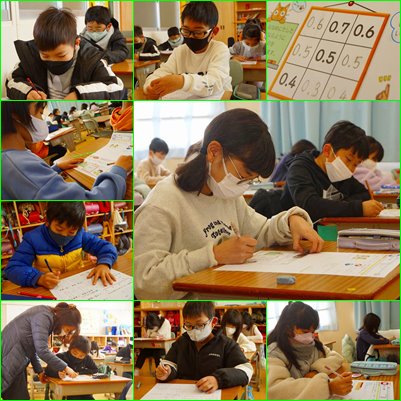 小数のテストでした。計算ミスが起こりやすいので、何度も見直しをしていました。最後の魔法陣は、いろいろな数をあてはめては消して、またあてはめては消し、何度もチャレンジしながら完成させていました。