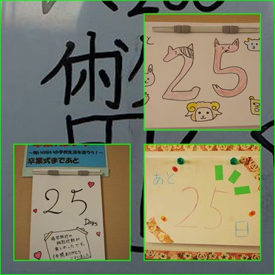 6年生のどの教室にも卒業カレンダーの掲示がされています。卒業するまでに学校に来るのはあと25日になったそうです。一人一人が書いた数字に、残りの日々を惜しむ気持ちが現れているようです。