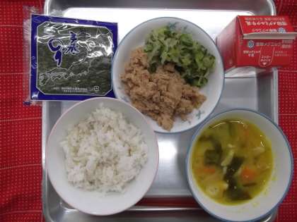 今日の給食は、麦ごはん・かぼちゃのみそ汁・ツナの甘辛煮・ハリハリづけ・手巻きのり・牛乳でした。