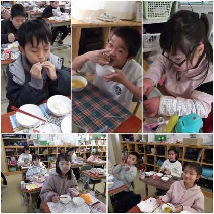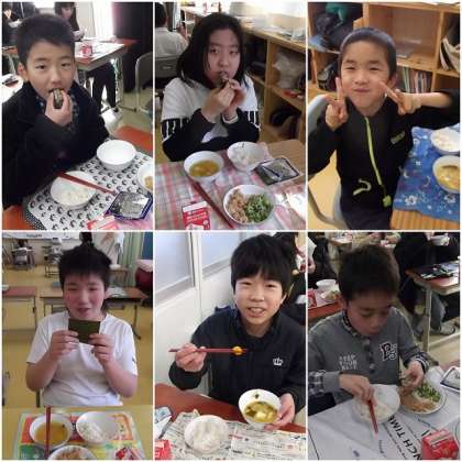 のりにごはん、ツナ、ハリハリづけを乗せて、上手に巻いて食べていました。前回はのりがついていなかったので、今回のりがついていて喜んでいる子が多かったです。のりだけで食べている子もいました。