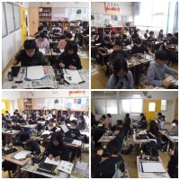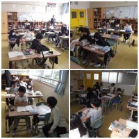 「のってみたいな いきたいな」の作品を制作中です。様子を見ていると、何人かが立ち上がって、高いところから自分の作品を眺めています。全体の色のバランスだったり、描きたいものの配置のバランスであったりと、立ち上がって高いところから作品を見ることで、座ったままでは見えないものが見てくることがあります。担任から言われたのではなく、おそらく自然にそうなったのだと思います。もしかしたら、その方が楽だっただけかもしれません。興味深いシーンでした。
