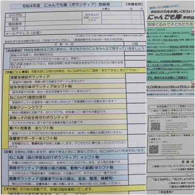 未来を生き抜く子どもたちを地域の皆様とともに育てていけたらと思います。無理なくできる範囲で、できる活動にご参加いただけるとありがたいです。登録は、配付いたしました手紙からでも右のにゃんでも隊登録から活動までの流れのQRコードからでもできます。ご登録、お待ちしております。