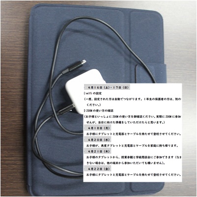 18日(月)にタブレットと充電器とケーブルを持たせていただき、また授業参観前日にお子様が持ち帰りますので、21日(木)はお子様のタブレットからご参加ください。