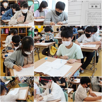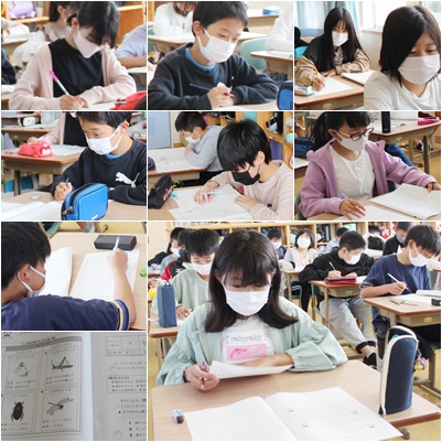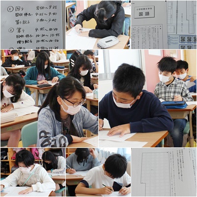 6年生は全国一斉の全国学力・学習状況調査に取り組みました。1時間目は国語、2時間目は算数、3時間目は理科、4時間目は学習や生活の様子についてのアンケートと長時間の調査ですが、最後までよく頑張りました。図やグラフから読み取る問題や要約、考え方を説明する問題が出題され、集中して取り組んでいました。