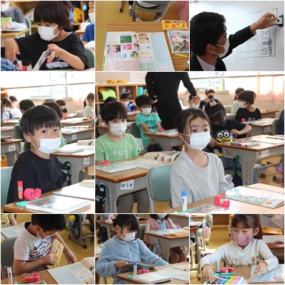 図工の時間に使う用具の確認をしていました。ホワイトボードに描かれた絵と同じように自分の机の上に用具を並べます。名前は書かれているか、色はそろっているか、どういうときに使うかなどを確認しました。