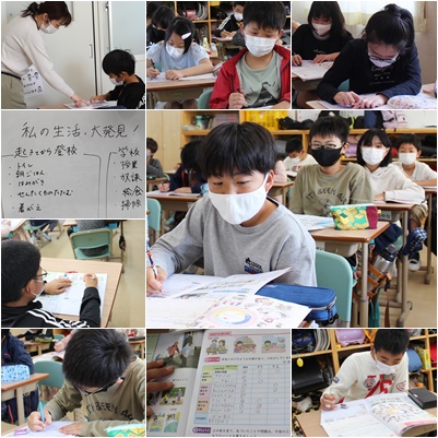 自分の生活を振り返った後で、家庭にはどのような仕事があり、誰がしているかを調べていました。表に書けないほど、いろいろな仕事がありました。誰がしているか〇をつけ始めると、子どもたちが担当していることが多いことに驚きました。この結果を見て刺激を受け、さらに子どもたちが進んで仕事を進んでするようになったら素晴らしいです。