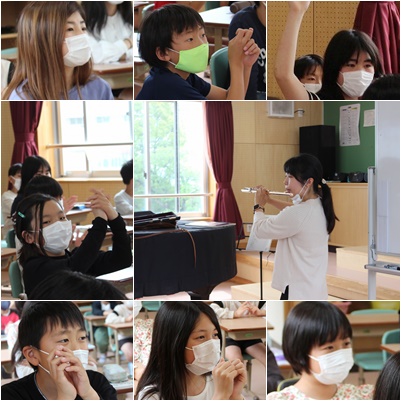 教科担当が自己紹介をしながら、フルートを演奏しました。なめらかなフルートの響きに合わせて、聴いている子どもたちの体も動き出していました。「パイレーツ・オブ・カリビアン」や「ルパン三世」のテーマ曲、アニメの主題歌などたくさんの曲を聴かせてもらいました。口ずさんだり、一緒に歌ったりして、楽しい時間となりました。