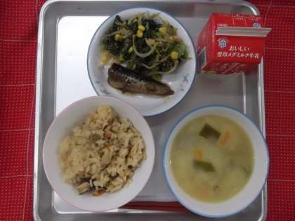 今日の給食は、たけのこごはん・呉汁・いわしの梅煮・小松菜のごまあえ・牛乳でした。