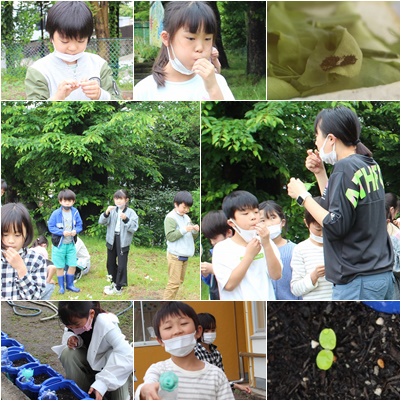 お楽しみとしてカラスノエンドウで笛を作りました。「あれ、鳴らない!」コツがあるようです。私も、昔よく作りました。花の蜜をすったり、レンゲで首飾りを作ったりしたことが懐かしいです。