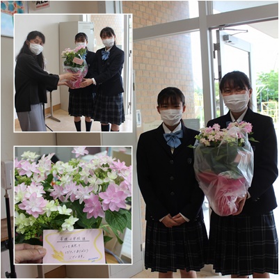 聖カピタニオ女子高等学校の学生が、「創立記念日にあたり、感謝の気持ちを皆様に」とお花を届けてくださいました。カピタニオ高校の皆さんには、夏の学習会で勉強を教えていただいたり、クリスマスカードをいただいたりとお世話になっています。