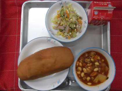 今日の給食は、ロールパン・ポークビーンズ・イタリアンサラダ・牛乳でした。