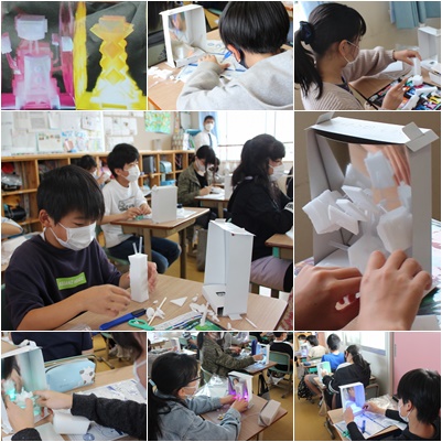 「光の形」の制作です。今日は、箱の中の立体部分を作っていました。下から光が差し込むと周りに反射して幻想的な世界が広がるように考えます。発泡スチロールをくりぬいたり、ストローでつないだりして、幾何学模様を作っていました。光の反射具合を試しながら、芸術的なセンスを表現していました。