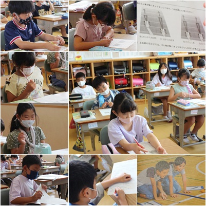 前回はゴムの働きを利用して、車を的の近くに止めるゲームを楽しみました。今日は、学習したことのまとめのプリントに取り組みました。皆、とてもよく理解していました。体験は大切ですね。