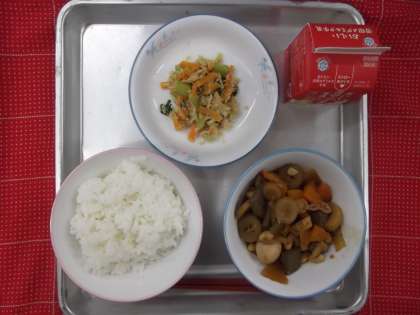 今日の給食は、ごはん・うずら卵の鉄火みそ・アーモンドあえ・牛乳でした。