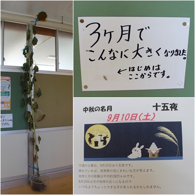 「ひまわり」の実物が展示してあります。一粒の「タネ」からこんなに大きくなりました。背比べをしてみるといいですね。校庭のひまわりは、今は、おじぎをしているように見えますよ。