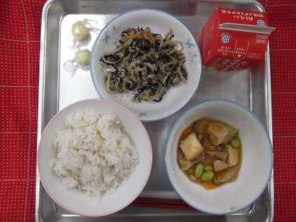 今日の給食は、麦ごはん・とうがんと鶏肉の煮物・五色あえ・牛乳・キャンディーチーズでした。