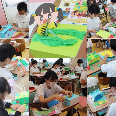 「くるくるクランク」の製作です。線を描くのではなく、色画用紙を切り貼りして飾りを作っているので、とてもきれいに仕上がっています。立体的に表す工夫もしていました。机の上の作品を見ていると、まるで遊園地のようでした。