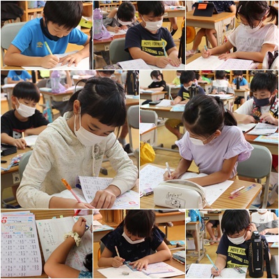 筆算の引き算です。解き方を確認した後は、次々と問題を解きます。集中して解いています。とにかく、たくさん問題を解いて、慣れることが大切です。繰り下がりのある引き算の暗算が、速くできるようになると、強みになりますね。