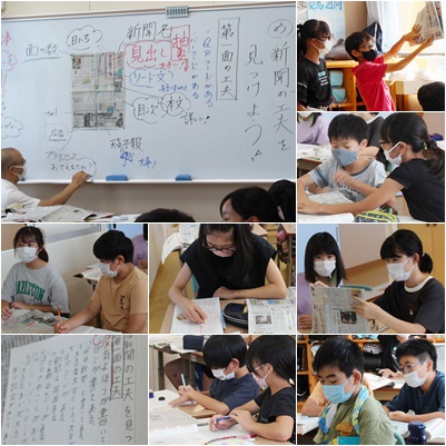 「新聞の工夫をみつけよう」の学習です。隣の友達と確認をしながら、工夫を見つけて、ノートに書きだしていきます。「20個以上見つけました」「まだあります」」とぎっしり書いたノートを見せてくれました。どの工夫にも意味があり、その工夫は何のためかについても語り合っていました。