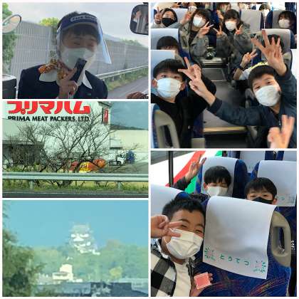 ガイドさんがバスから見える建物の案内をしてくれます。伊賀上野城やウインナー型のバスを見ることができました。