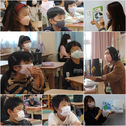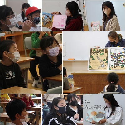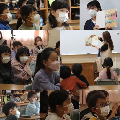 お待ちかねの読み聞かせの時間です。この時間は、いつも子どもたちの真剣なまなざしの写真を撮ることができ、私にとっても大好きな時間です。質問タイムや感想を発表する時間を作ってくださっているクラスもありました。