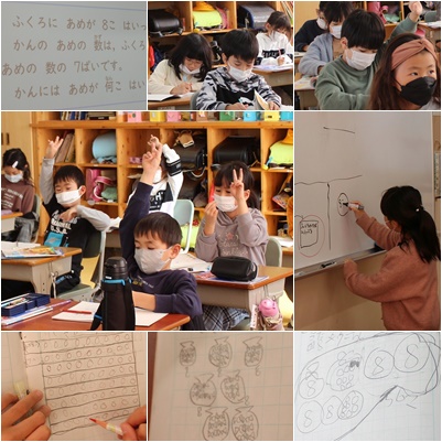 かけ算の問題です。問題の意味を絵で表します。ノートのマス目を利用して書いたり、袋の絵を書いたり、数字で表したり、書き方は、それぞれです。自分の方法で理解をしていきます。