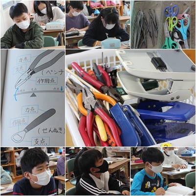 てこを利用した道具について学習しました。支点、力点、作用点という名前を学習した後で、身の回りの道具について仲間分けをしました。実際に道具が出てくるとテンションがあがりました。