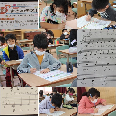 今日の音楽は、まとめのテストでした。テストが終わると、音符を書いたり、階名を読んだりするプリントに取り組みました。順番に数えながら、書いています。慣れてくるとすらすらと読めますが、暗号のように読んでいくことから始まりますね。根気よく取り組んでいました。