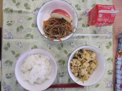 今日の給食は、ごはん・凍り豆腐の卵とじ・根菜のきんぴら・牛乳・りんごでした。