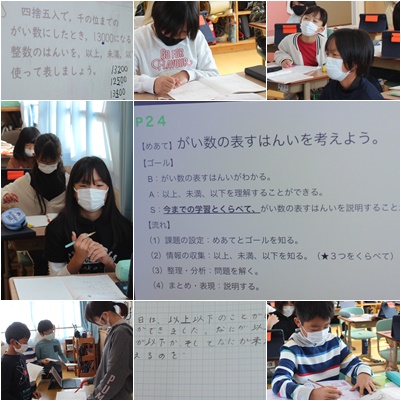 毎時間、【めあて】【流れ】【ゴール】が示され、この流れにしたがって学習を進めています。振り返りでは、今日の学習で学んだことを自分の言葉で書いていきます。どこまで理解をして、何が分からなかったのかを最後に教科担任に伝えます。一人一人の理解度を把握して、次の時間の授業を組み立てています。ユニバーサルデザインを意識した授業の姿です。