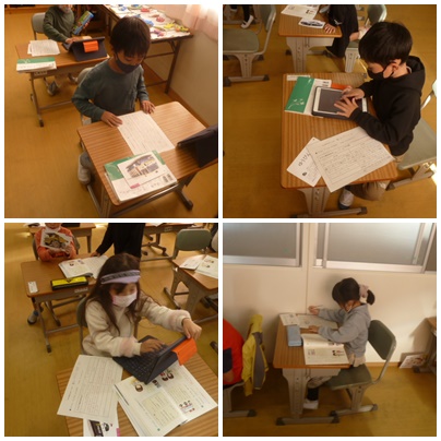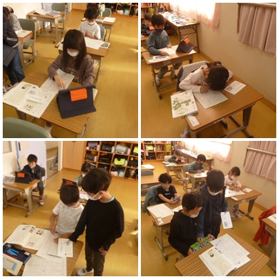 紹介したい自動車の特徴をまとめた「じどう車ずかん」を作っていました。それぞれの「しごと」と「つくり」を読み取って書いていきます。友だちとも読み合って、より良い文章になるようにしていました。