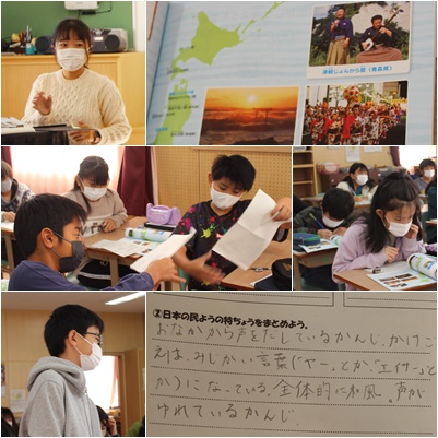 今日のめあては「日本の民謡の特徴をまとめよう」でした。盆踊りで聴いたことがある曲がありました。「ああ〜」などのかけ声や囃子ことばが聴こえてきます。独特の響きをそれぞれの言葉で表現していました。平安時代や大正時代など古くから伝えられてきたものもあることが分かりましたね。