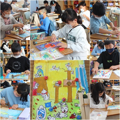 コリントゲームが出来上がりました。板に描いた絵が素敵です。高得点のところは、なかなか入らないようにくぎが打ってありました。作った後も楽しめますね。
