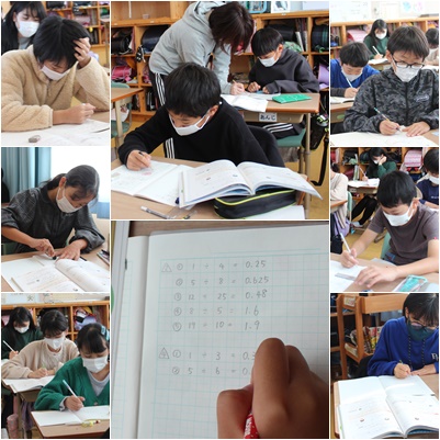 「分数を小数になおすには」どうすればいいのかを考えました。分数や小数の意味を考えると説明しやすくなりますね。「4年生に分かるように言いかえよう」をめあてに取り組んでいました。