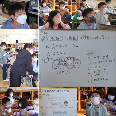 小数のかけ算の学習です。2×4と0.2×4の式を比較して計算の仕方を考えました。