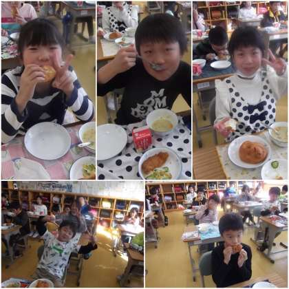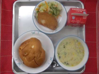 今日の給食は、りんごパン・豆乳コーンスープ・白身魚フライ・ミニフレンチサラダ・牛乳でした。