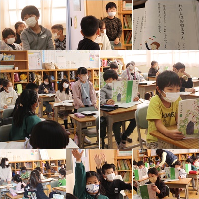 主人公のおねえさんはどんな人か読み取ったことを発表していました。皆、すぐに発表者の方に体の向きを変え、しっかりと話を聞きます。テンポよく次々と意見が出ました。確かめるために、全員で音読をしたときも、サッと本を持ち、良い姿勢でした。集中して学習ができていますね。