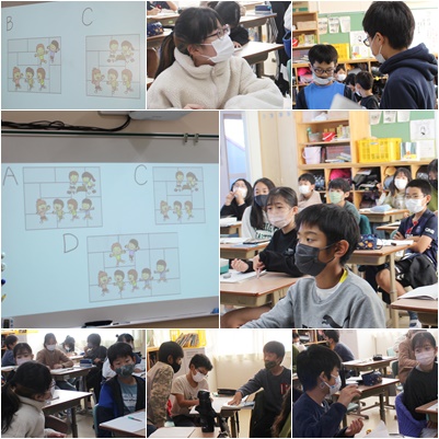 クイズです。1問目と2問目は、畳の枚数か子どもの人数のどちらかが同じだったので、2つを見比べて、すぐに答えが分かりました。3問目は比べるものが3つあり、それぞれに違うので「あれ、どれかな?」と分からなくなりました。さて、どうやって比べると良いのでしょうか。話し合いが始まりました。