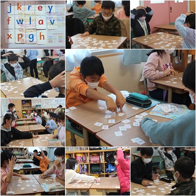 アルファベットのカルタ取りです。似ている発音のアルファベットがいくつかあります。