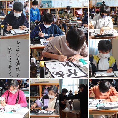 「あこがれ」を練習しました。漢字と違って、流れるようなやわらかい筆づかいを意識していました。中心がずれないように、紙を細かく折って目印にして書いていました。書家のように気持ちよく書けるといいですね。