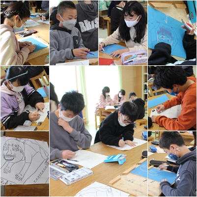 版画の下絵が描きあがり、いよいよ『彫り』に入りました。版画の面白さを表現するために、どのように彫るか、白と黒のバランス、重なっているところの線の残し方など、多くのことを周到に考えて作業する必要があります。今日は、まず、顔を彫ることを目標に取り組んでいました。