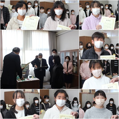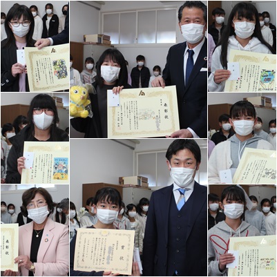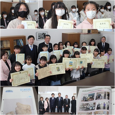 「税に関する絵はがきコンクール」の表彰に瀬戸旭法人会から6名の方においでいただきました。18名が入賞し、優秀賞、尾張瀬戸税務署長 表彰、税務連絡協議会 会長賞、女性部会 部会長賞、女性部会 特別賞と大きな賞もいただきました。それぞれの会長様より表彰をしていただけました。作品がのせられている賞状もありました。とても素敵な賞状です。