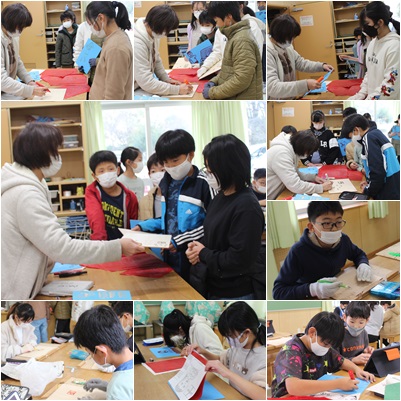 版画板の裏面を使って彫り方の練習です。教科担任から一人ずつ目の前で、どのように彫るか説明を聞きます。その課題ができると見せに行きます。線を残すように縁取りを三角刀で彫り、中を丸刀で彫ります。この技術を習得してから、作品制作を始めます。