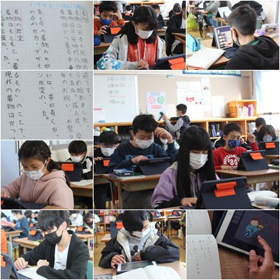 日本的な文化について、パンフレットを作ります。衣・食・住・伝統工芸品・行事・習わし等、内容が多岐にわたり、互いに見せ合うのが楽しみです。制作時間が決まっているためでしょうか、ものすごい集中力で作っていました。