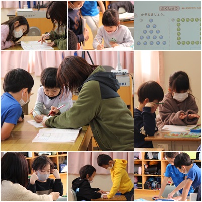 復習問題を解き終わると、担任に見てもらいます。〇がもらえるか、のぞき込むように、見ていました。たとえ、間違っていても全く心配ありません。できるようになれば大丈夫です。計算中に指が足りなくなった子に自分の指も出して、協力しながら説明してくれる友達もいました。