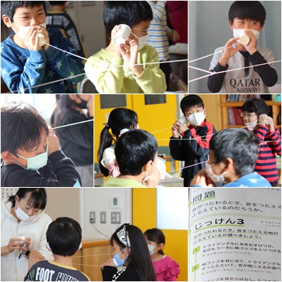 糸電話で音の伝わる様子を観察しました。4人分つながっている枝分かれの糸電話で実験をしました。ちょっとタイミングがずれると、皆が話す人になり、「あっ」と耳にあてなおすと今度は皆、耳にあてていました。息がぴったりすぎて、微笑ましかったです。